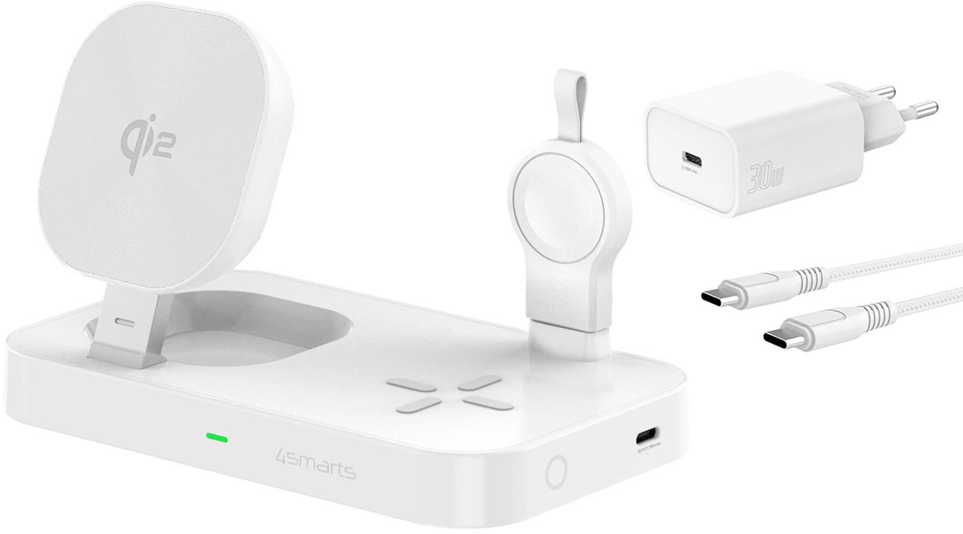 Unser 3-in-1 MagSafe Ladeständer liefert maximale Leistung für drei Geräte gleichzeitig. Im Lieferumfang enthalten ist ein kraftvolles 30W Netzteil samt USB-C-Kabel, um ein schnelles und effizientes Laden zu gewährleisten. Diese Komplettlösung erspart dir den Kauf eines zusätzlichen Adapters. So kannst du deine Geräte direkt nach dem Auspacken aufladen.